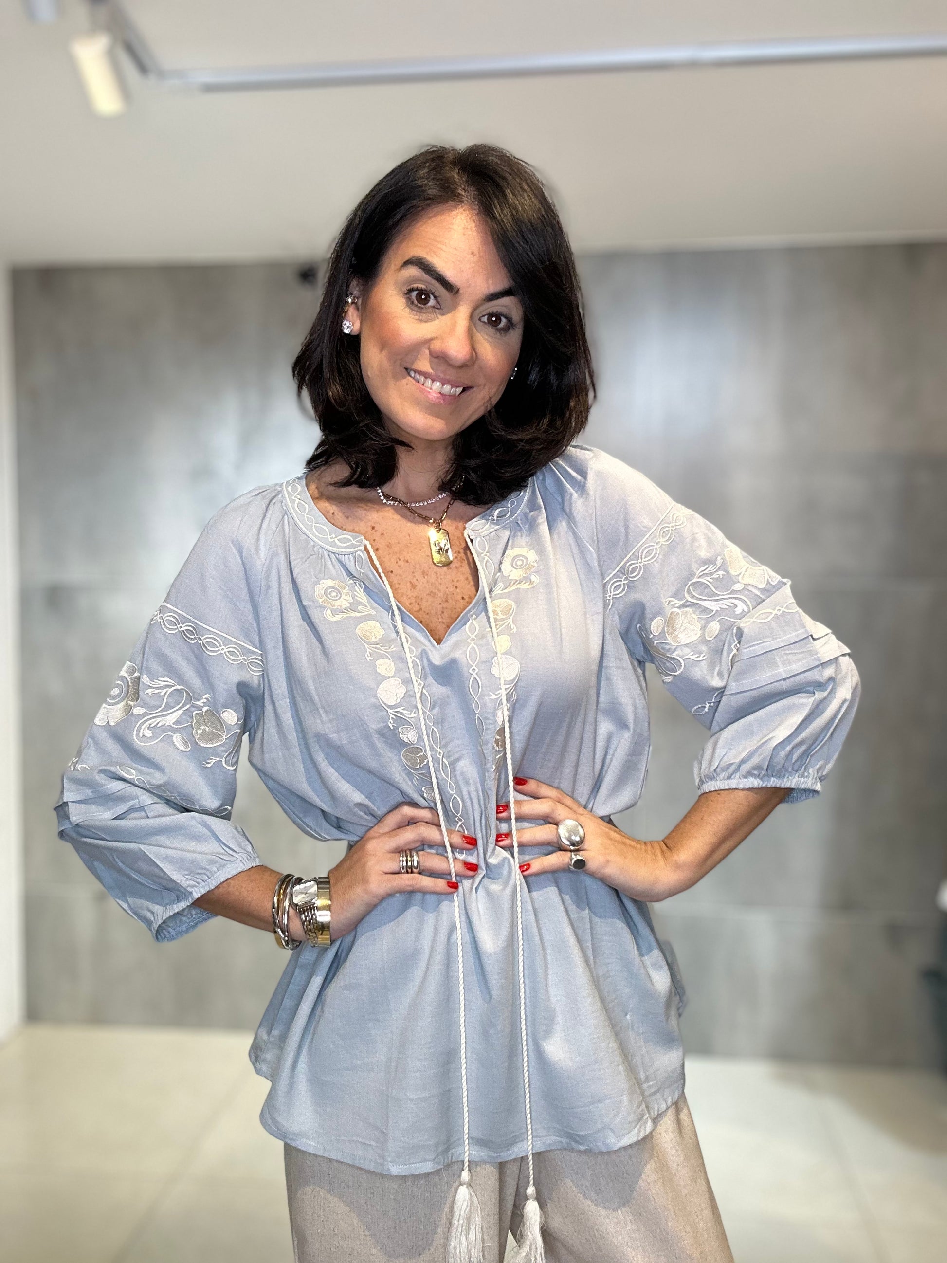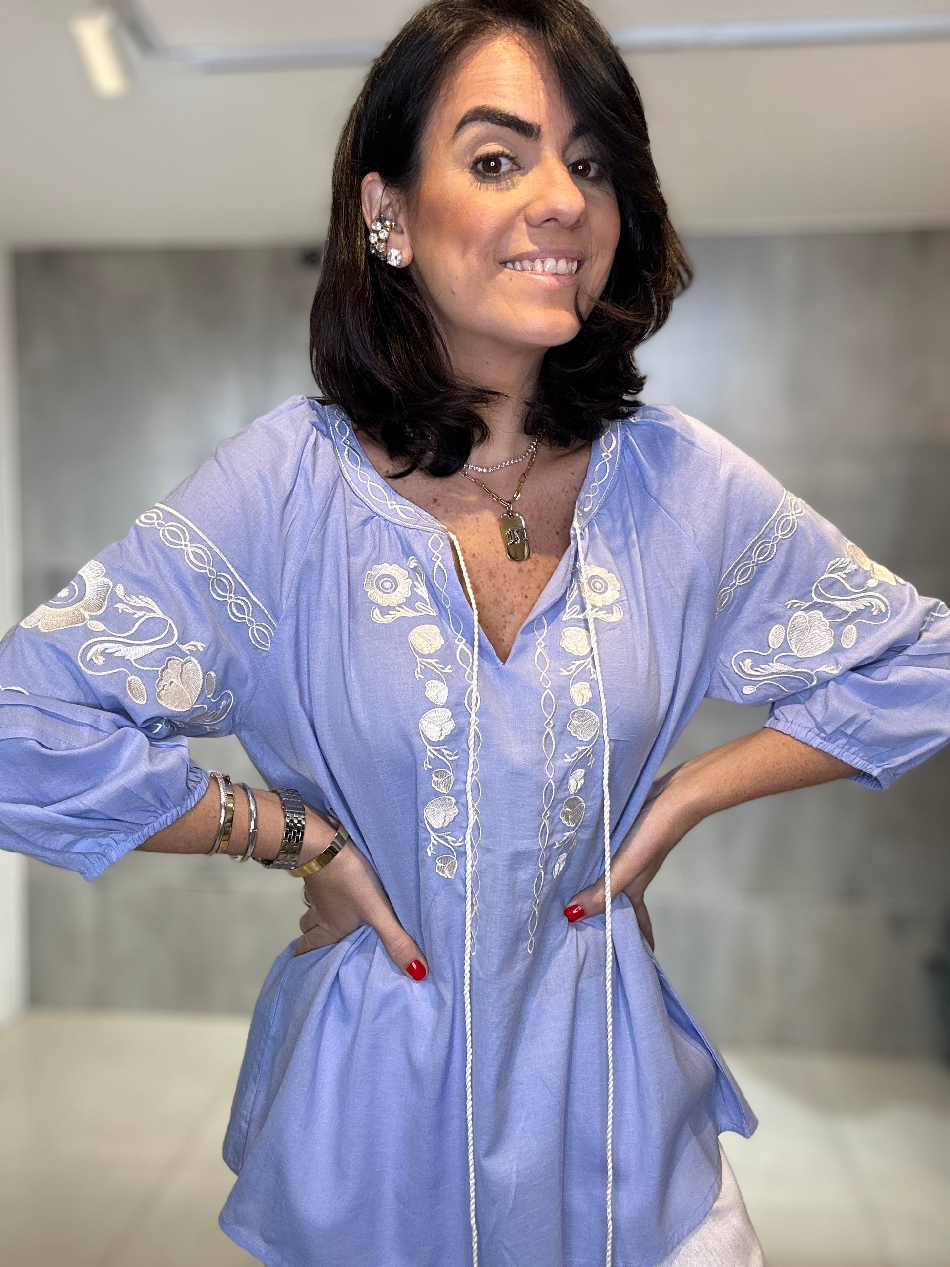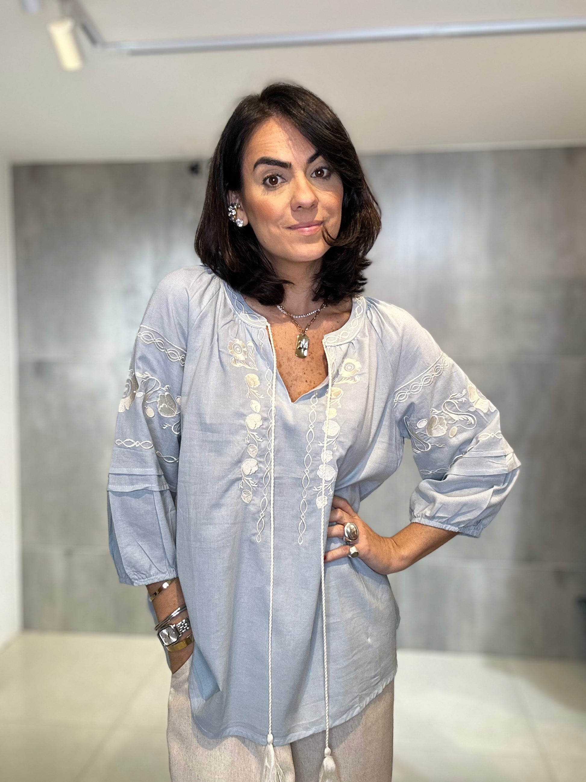 Confeccionada em viscose, ela traz um caimento fluido e confortável, elásticos no punho. Ideal para os dias mais quentes. O destaque fica por conta dos bordados artesanais, que adicionam charme e um toque boho sofisticado à peça.