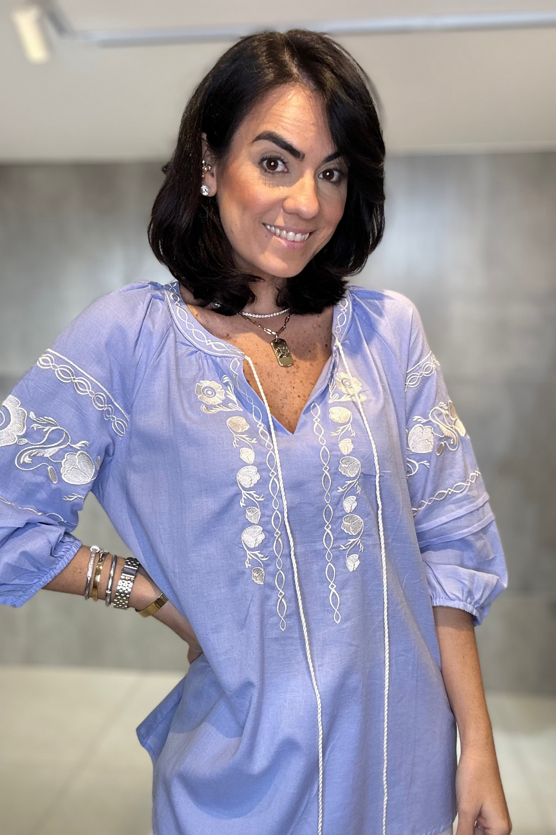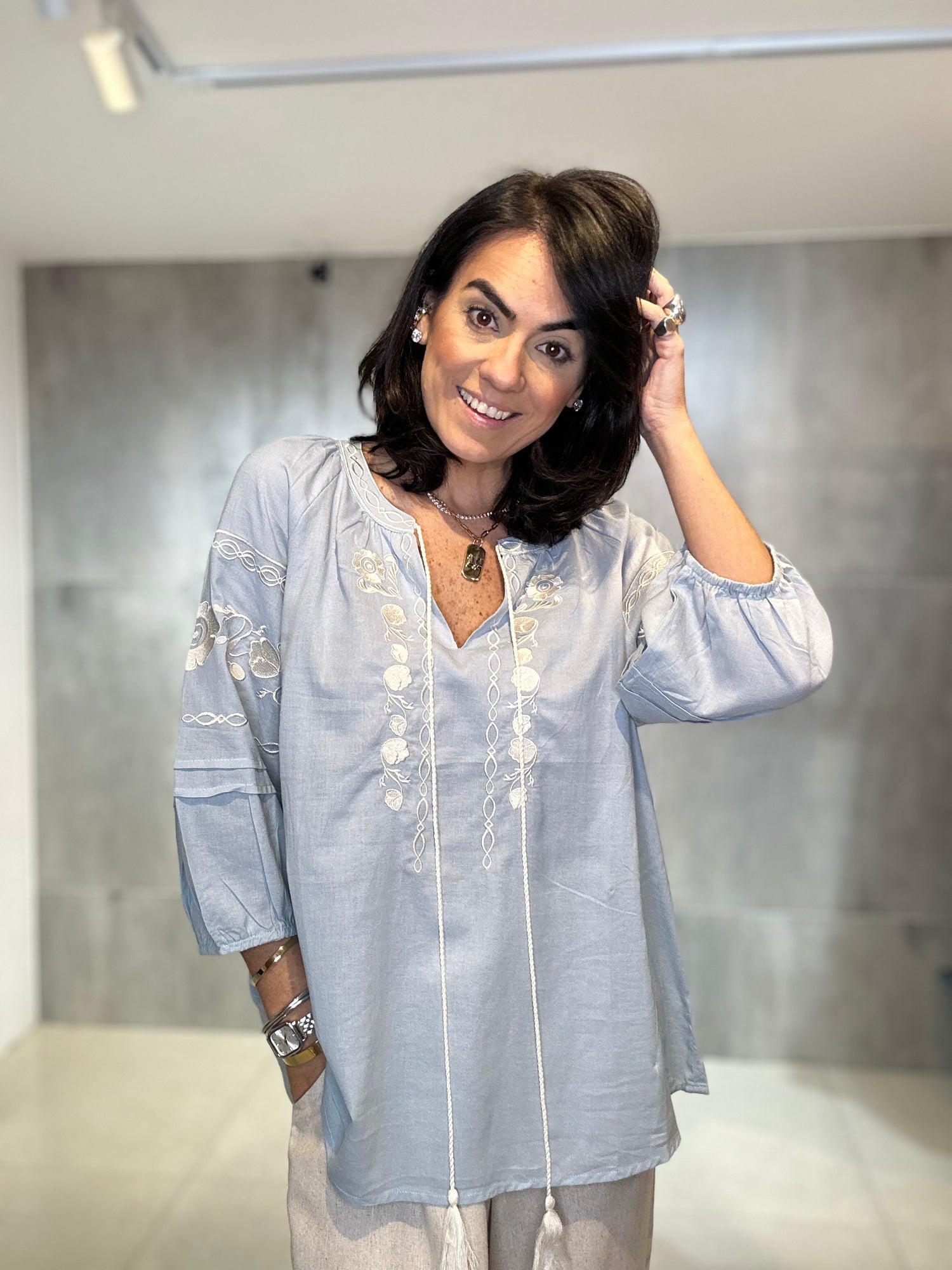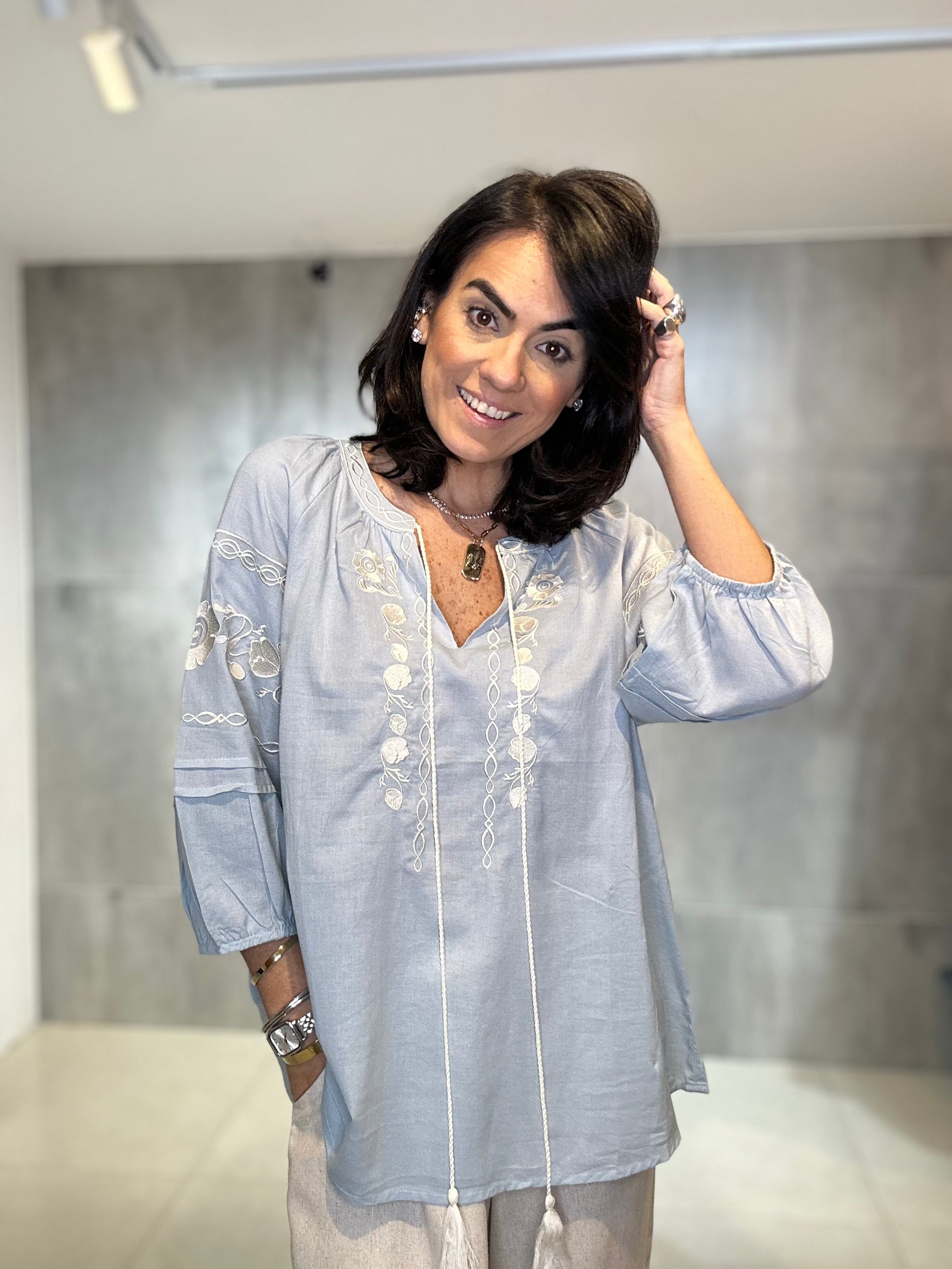 Confeccionada em viscose, ela traz um caimento fluido e confortável, elásticos no punho. Ideal para os dias mais quentes. O destaque fica por conta dos bordados artesanais, que adicionam charme e um toque boho sofisticado à peça.