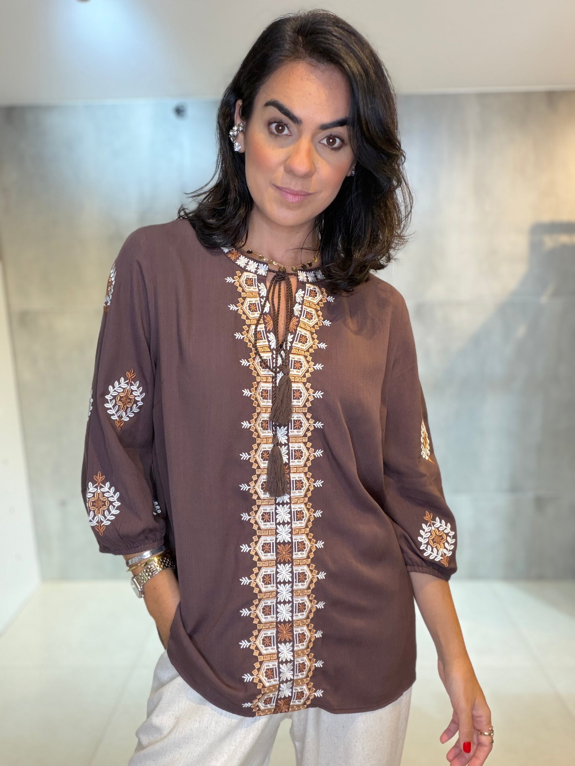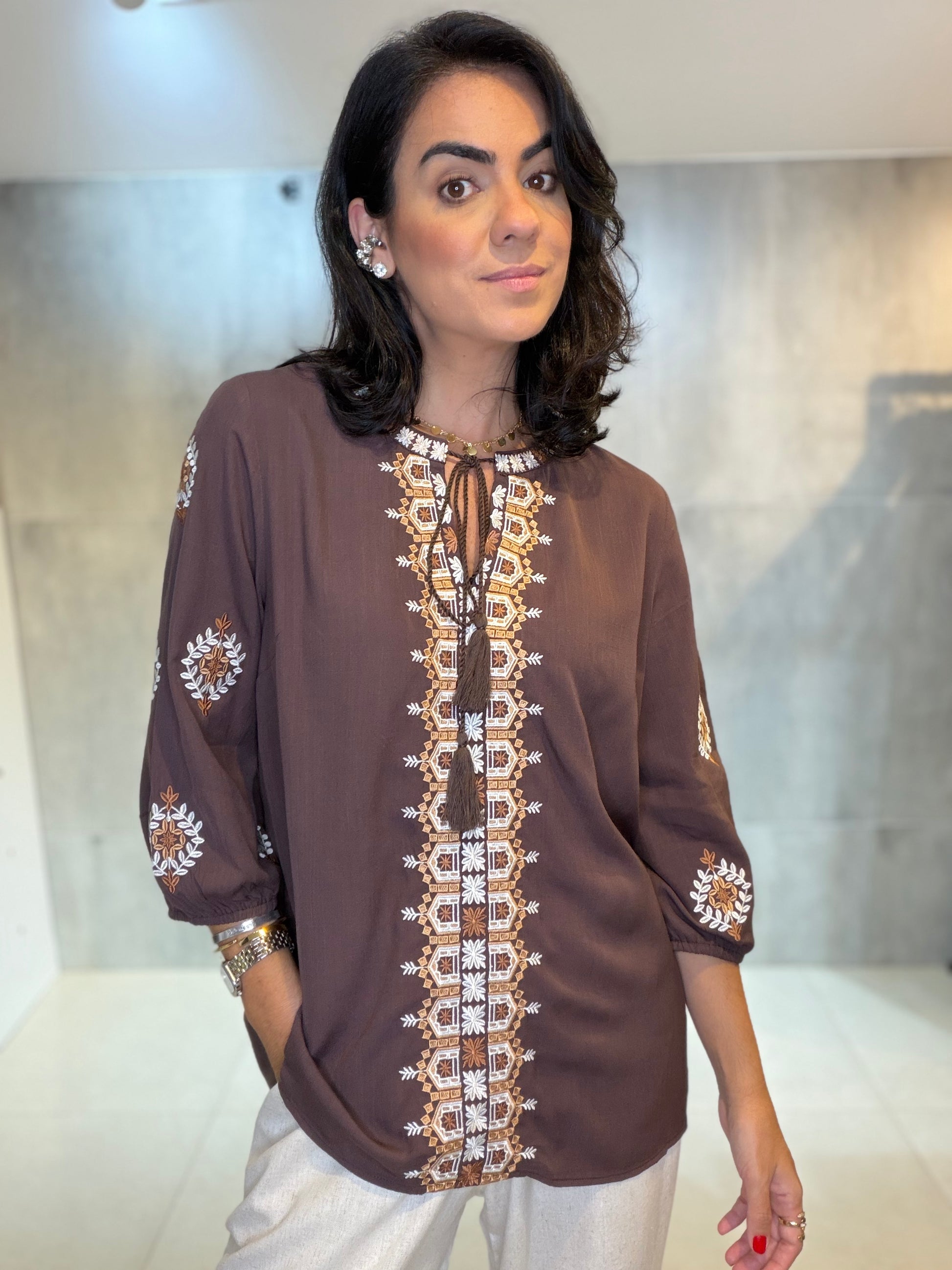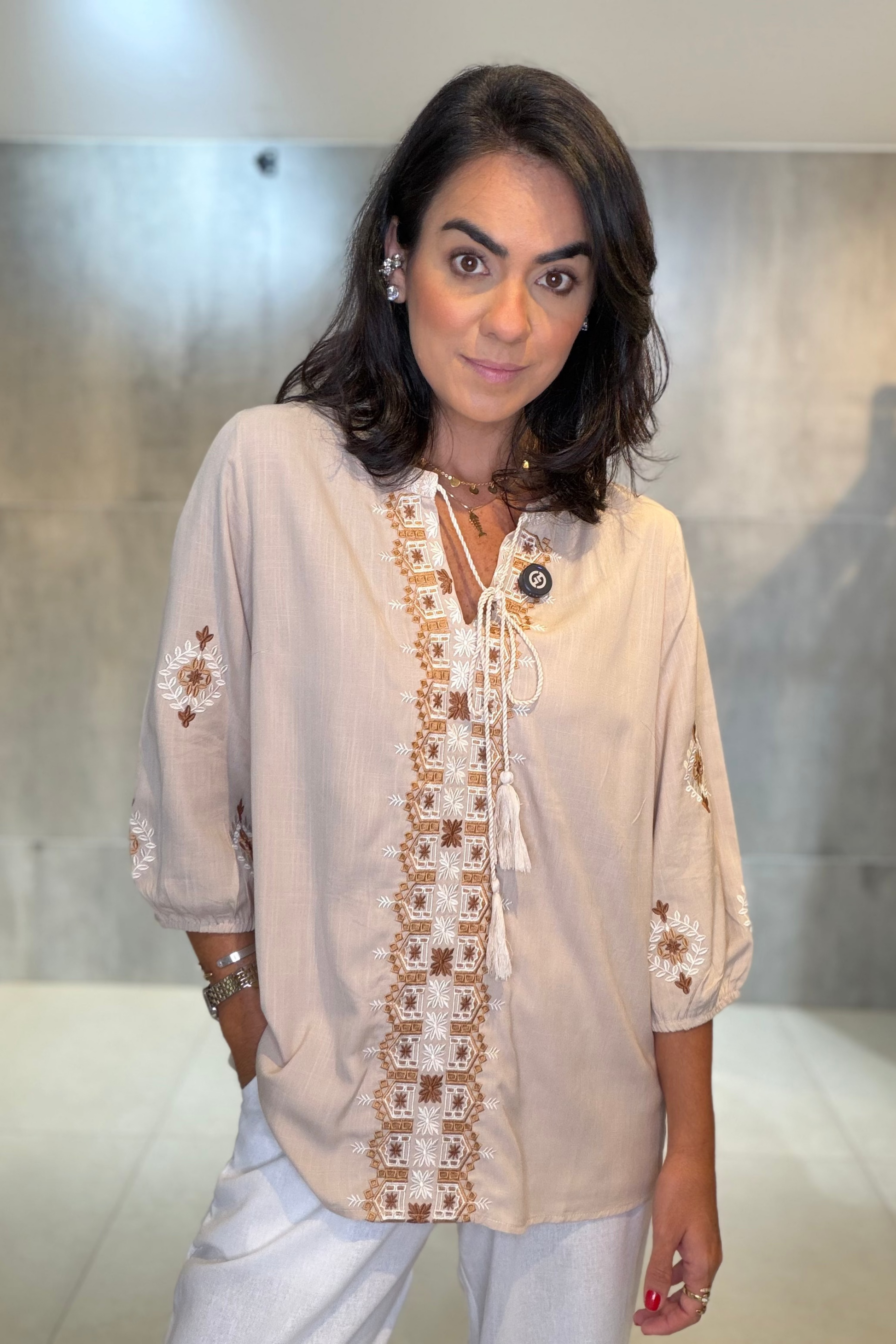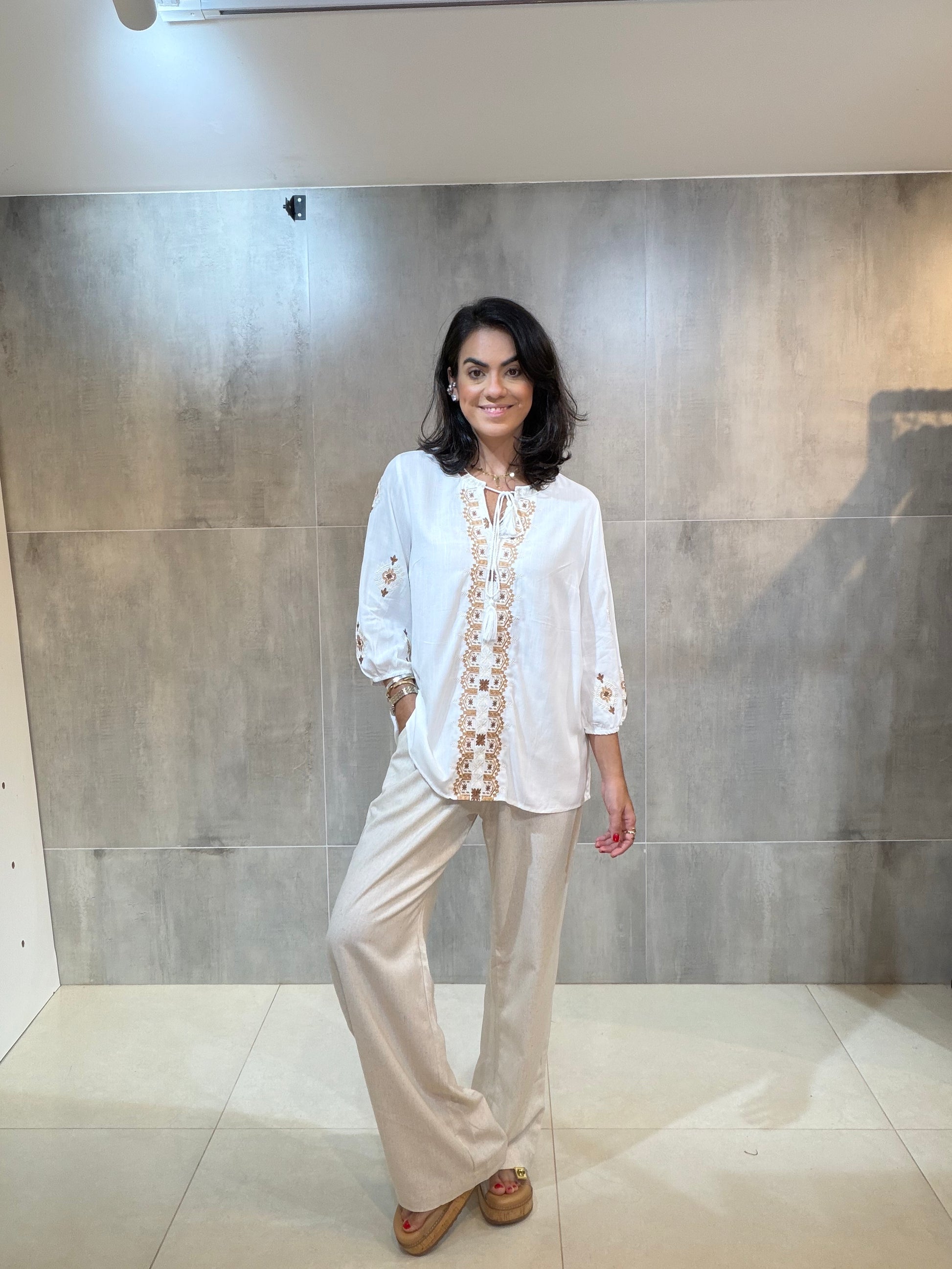 Bata em 100% viscose, leve e confortável, com bordado delicado no decote e nas mangas. Possui modelagem soltinha, decote com amarração e mangas 3/4, garantindo charme e versatilidade. Ideal para compor looks elegantes e casuais com facilidade.