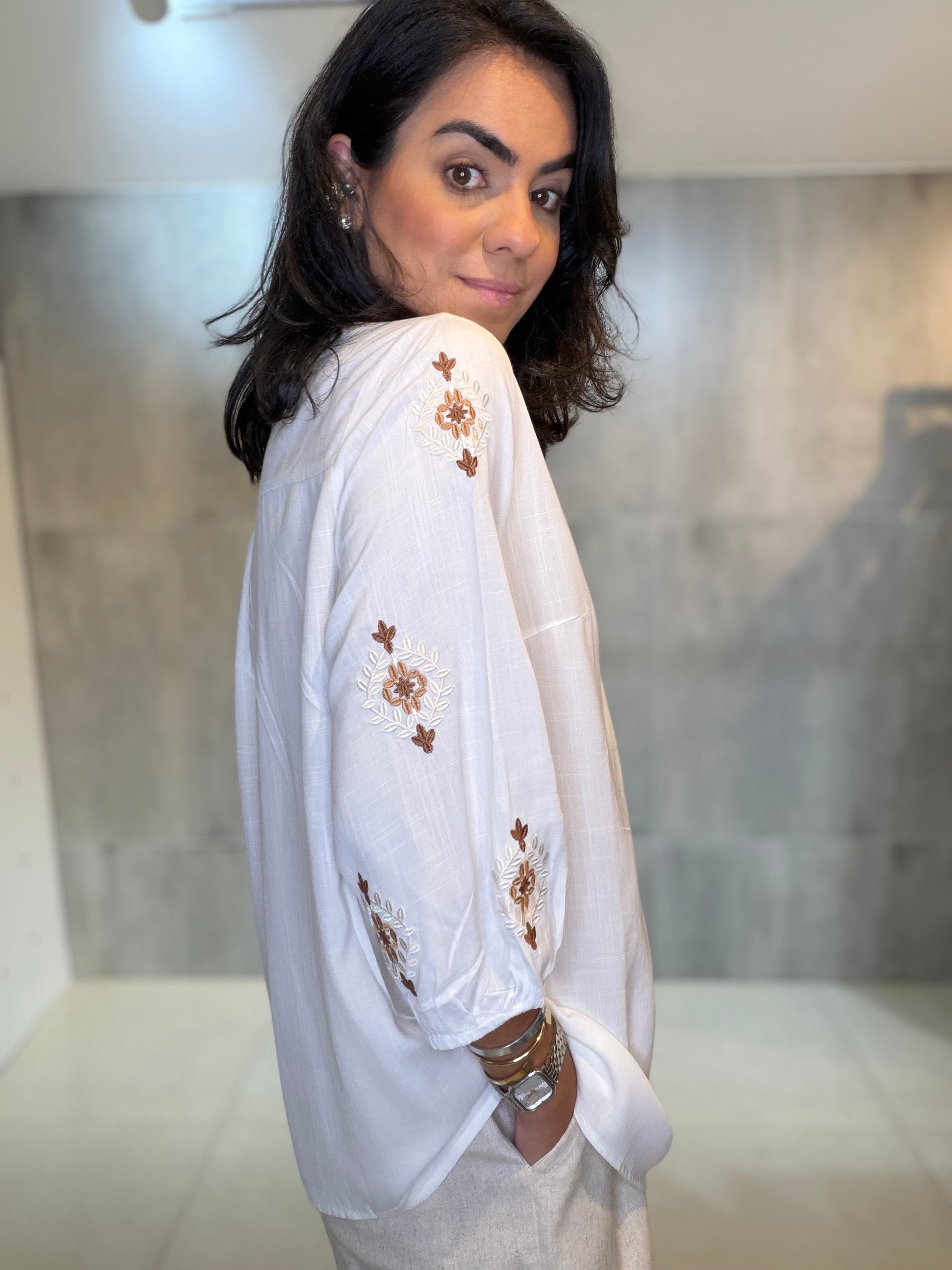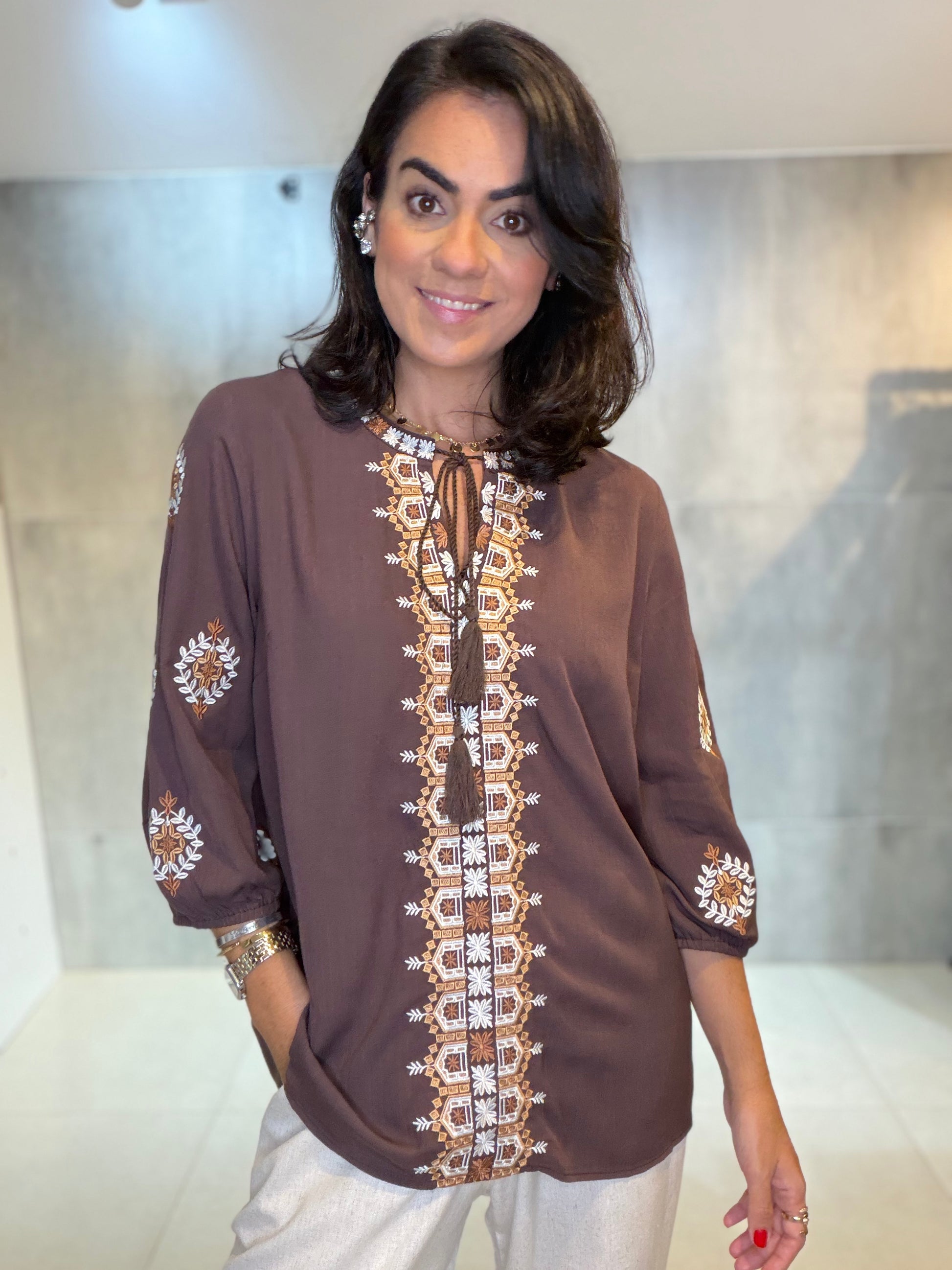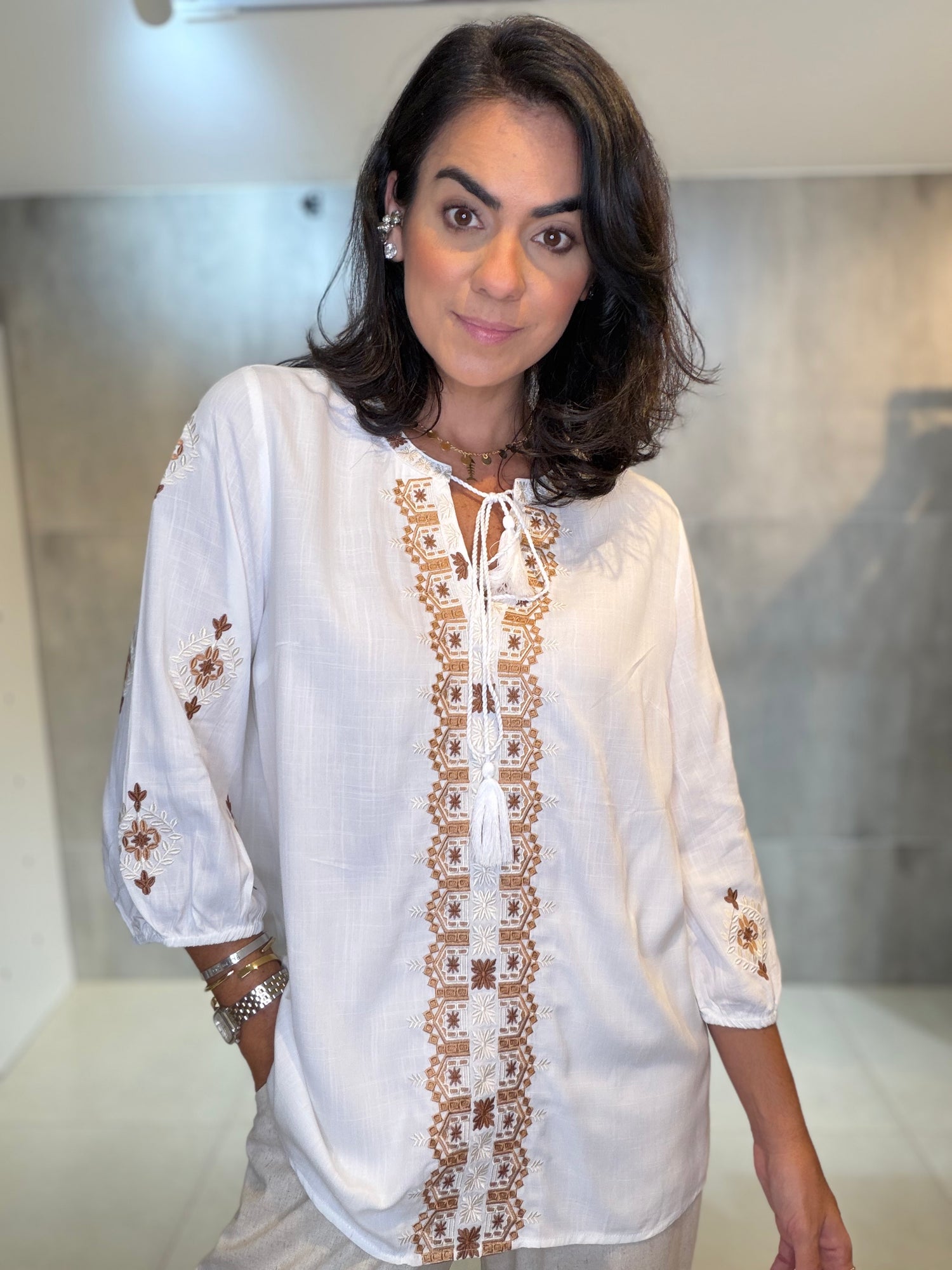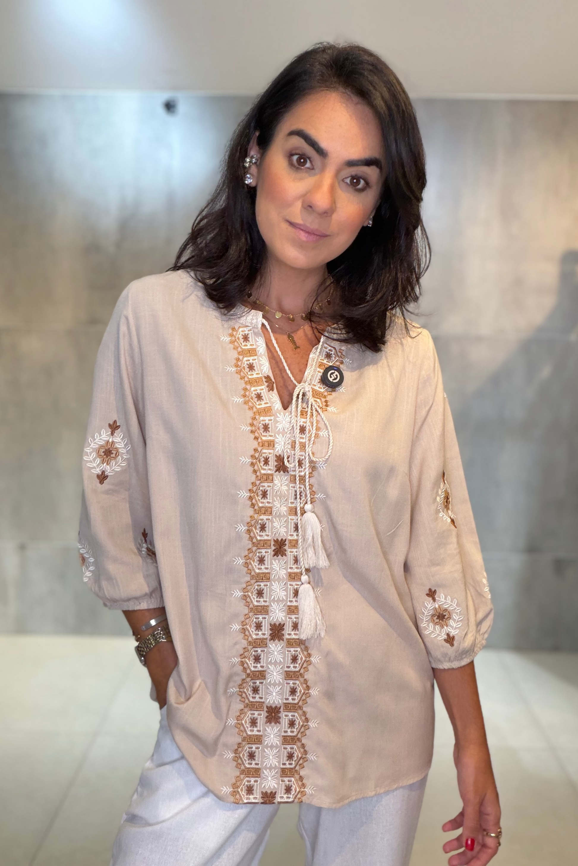 Bata em 100% viscose, leve e confortável, com bordado delicado no decote e nas mangas. Possui modelagem soltinha, decote com amarração e mangas 3/4, garantindo charme e versatilidade. Ideal para compor looks elegantes e casuais com facilidade.