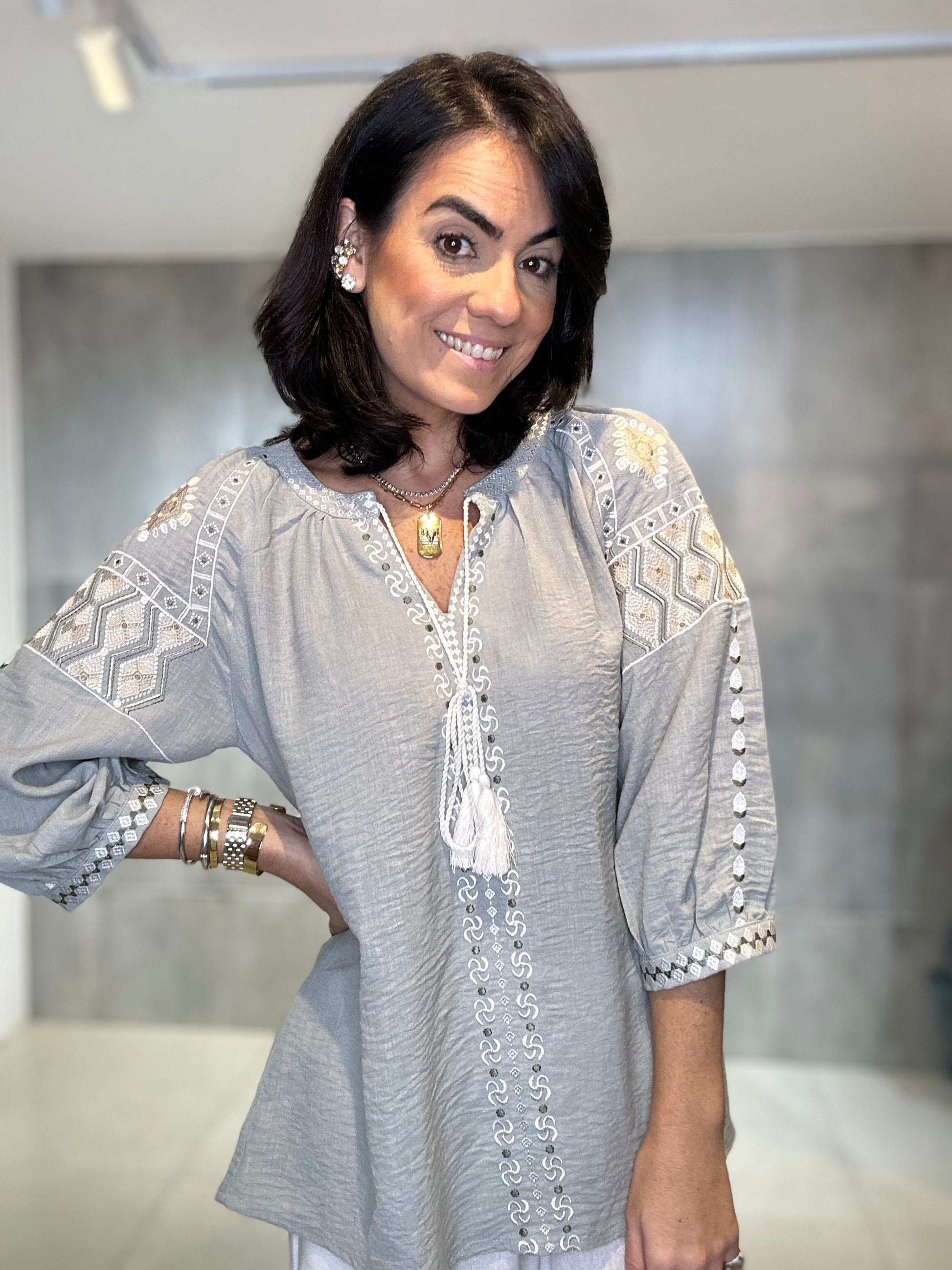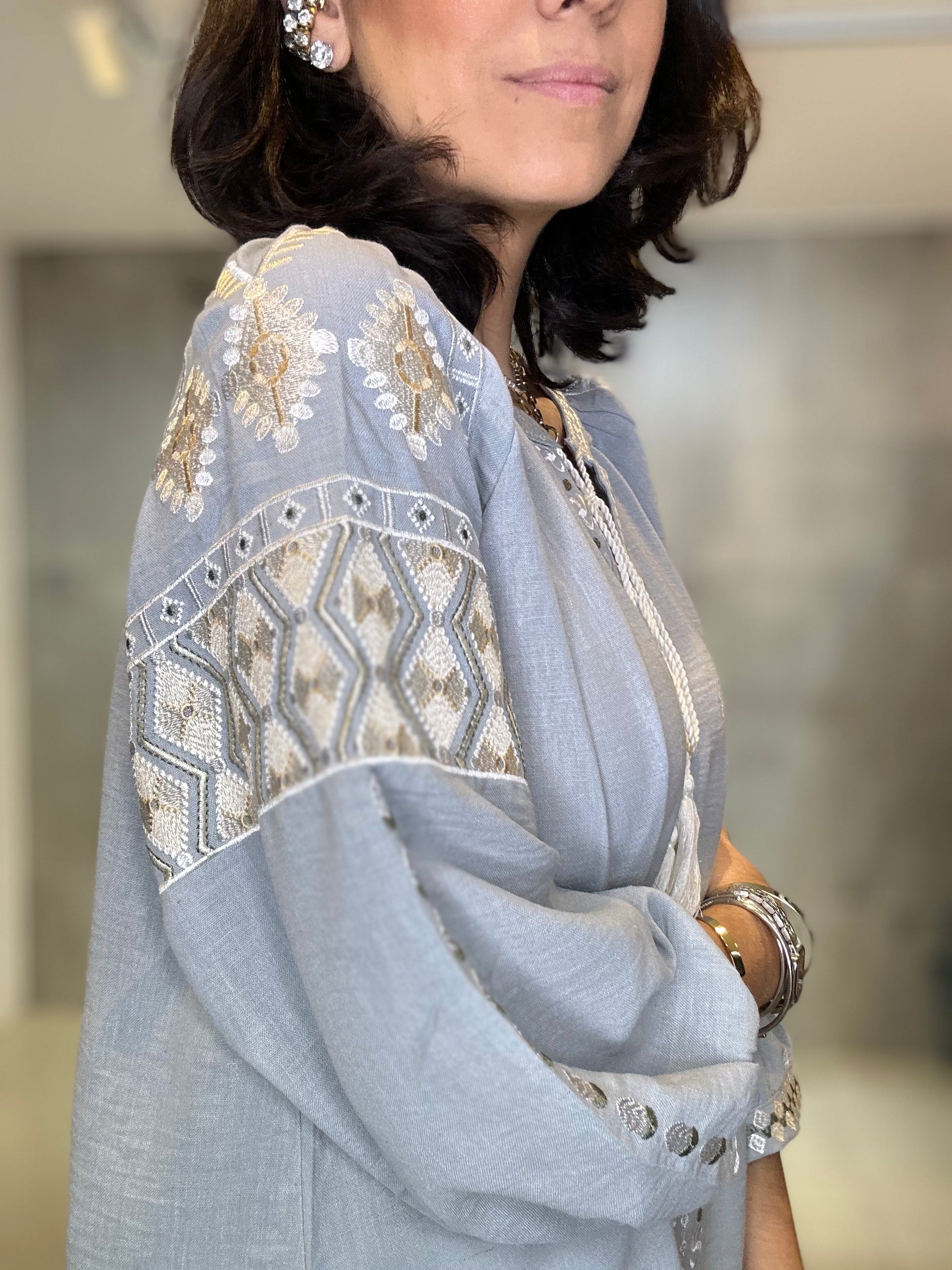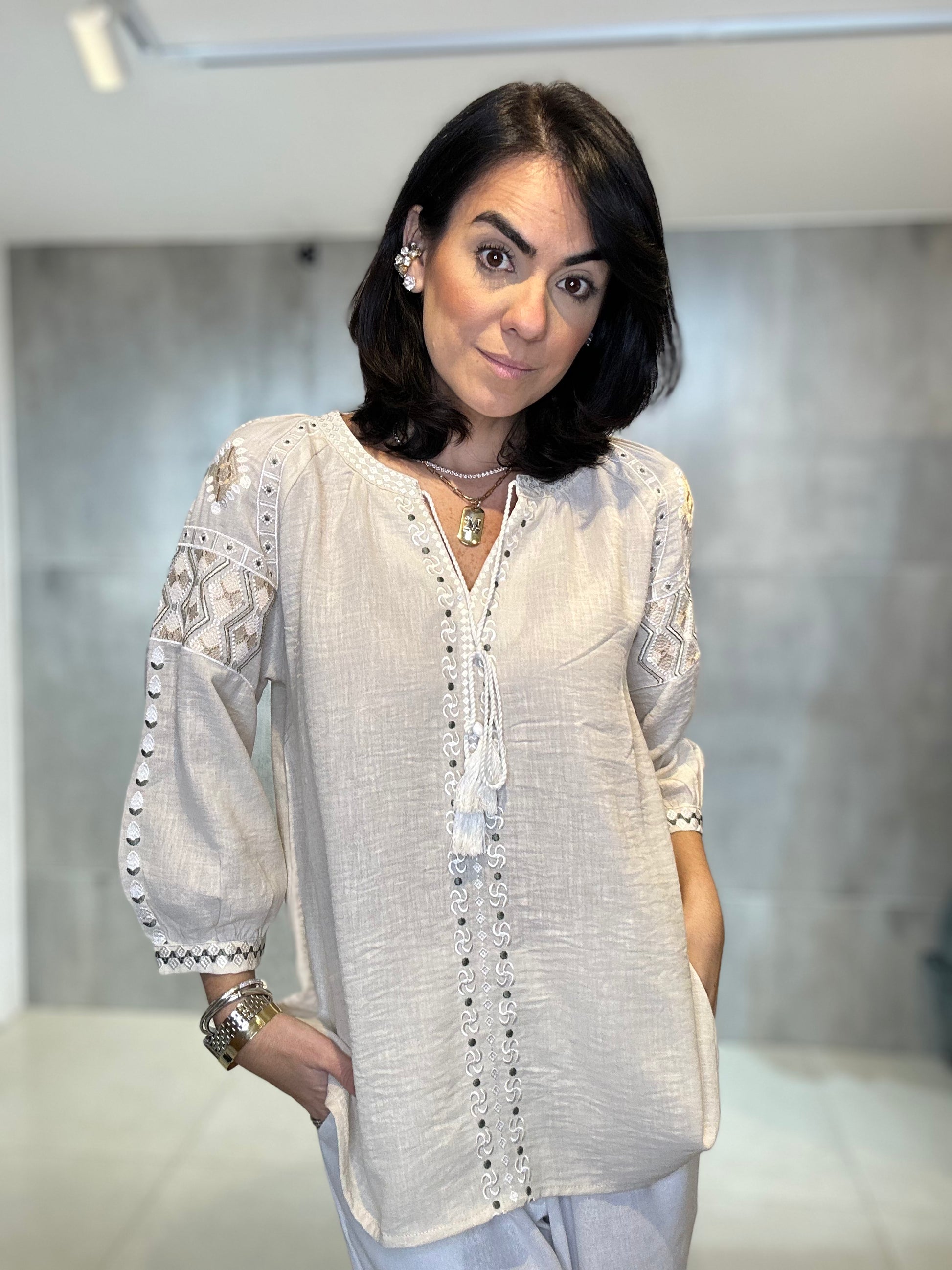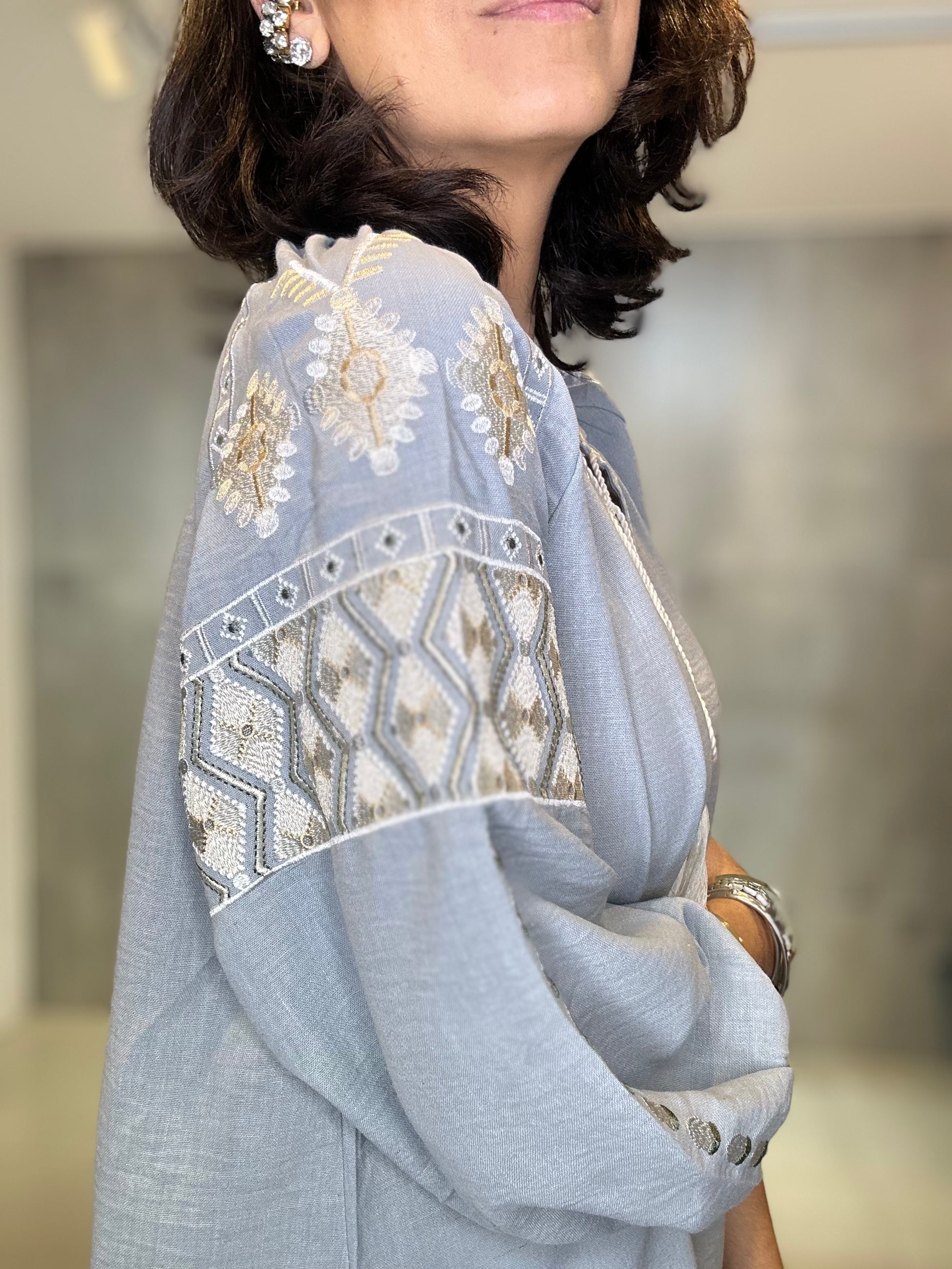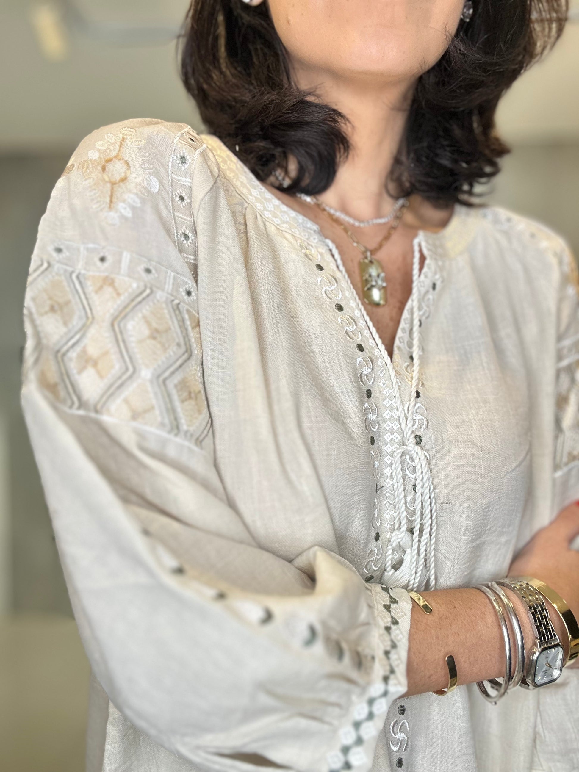 Bata ampla e solta, proporcionando conforto e um caimento leve. Rico bordado em linha de cor contrastante (branco/cru) nas mangas, ombros e peitilho. Os bordados nas mangas têm um padrão geométrico, enquanto os do peito são verticais. Estilo 3/4 com elástico/franzido discreto e acabamento bordado no punho, conferindo um leve volume. Decote em V com delicados botões frontais e um cadarço de amarração.