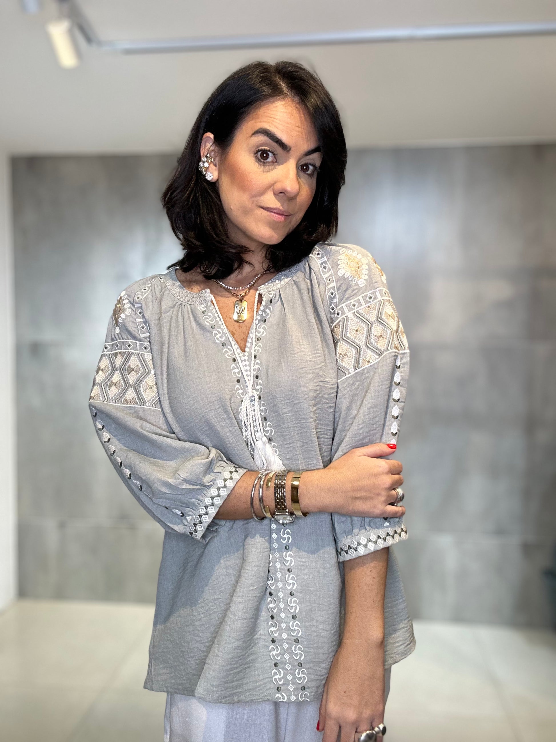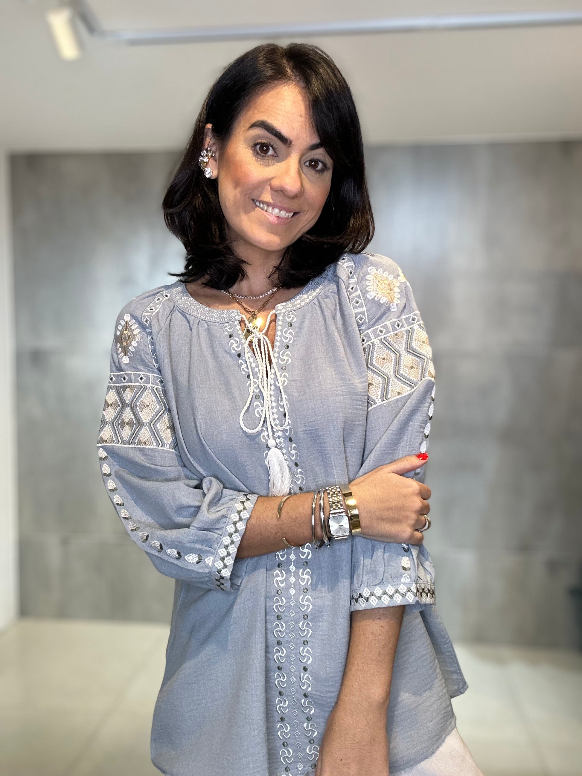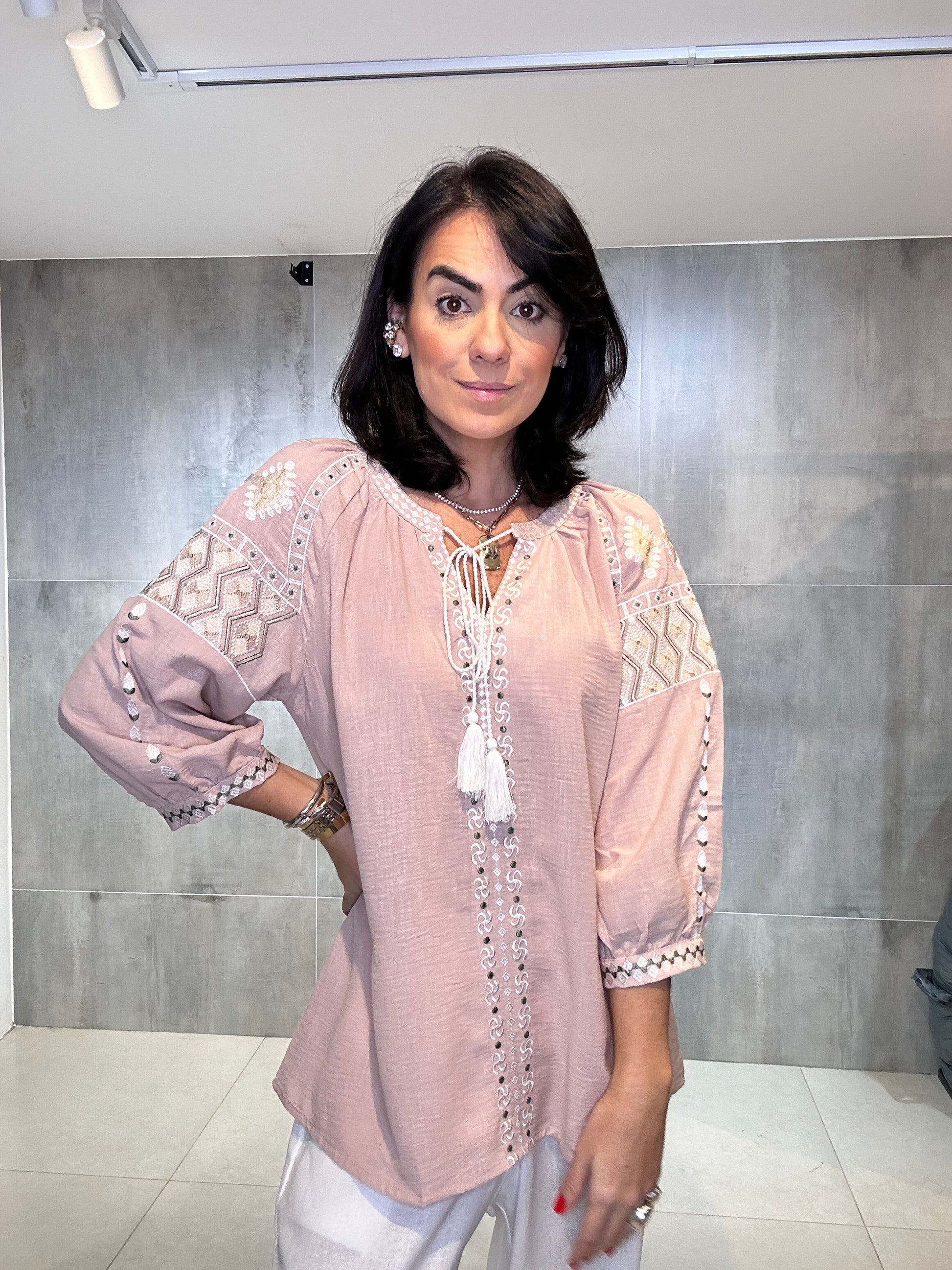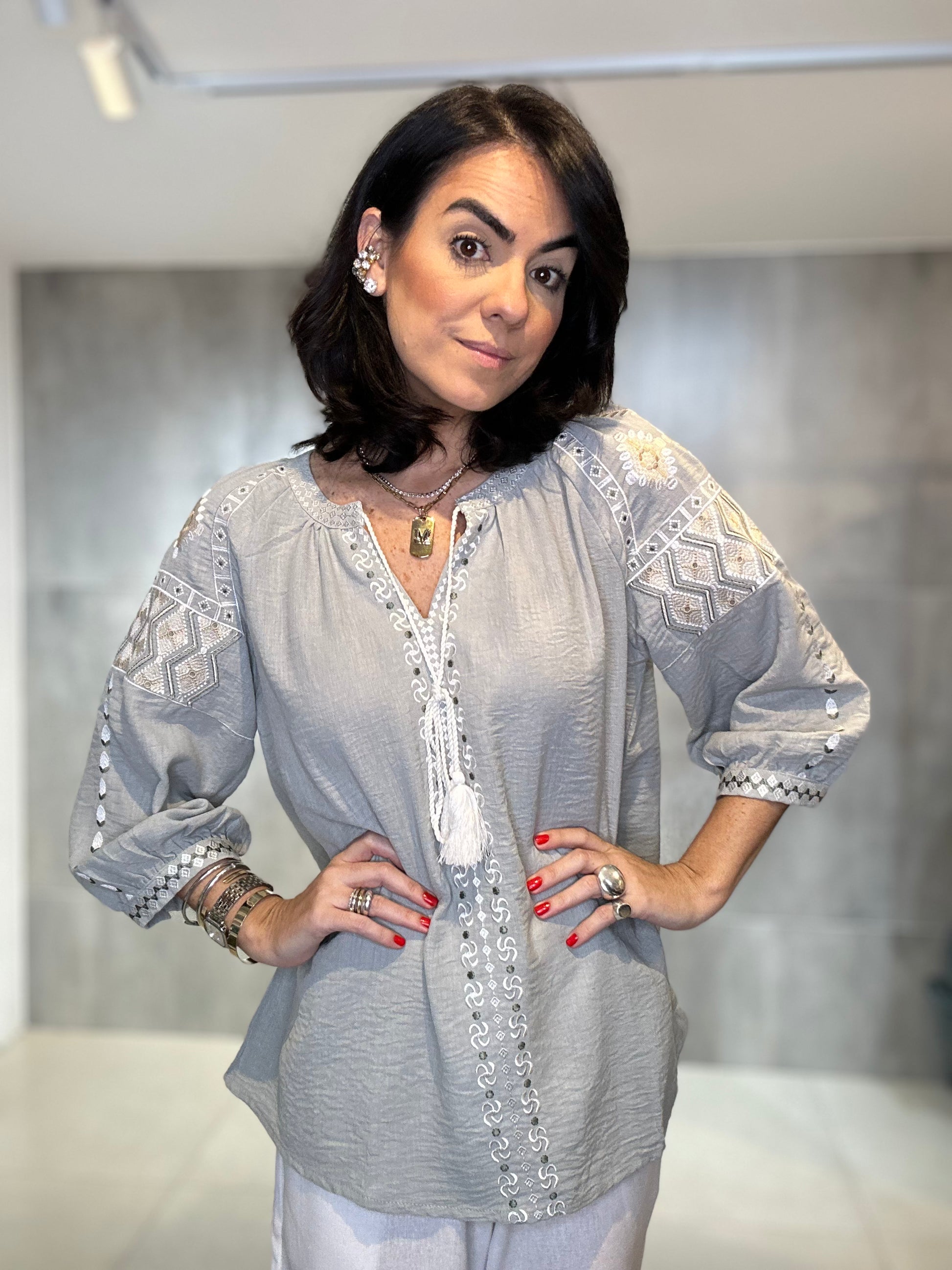 Bata ampla e solta, proporcionando conforto e um caimento leve. Rico bordado em linha de cor contrastante (branco/cru) nas mangas, ombros e peitilho. Os bordados nas mangas têm um padrão geométrico, enquanto os do peito são verticais. Estilo 3/4 com elástico/franzido discreto e acabamento bordado no punho, conferindo um leve volume. Decote em V com delicados botões frontais e um cadarço de amarração.