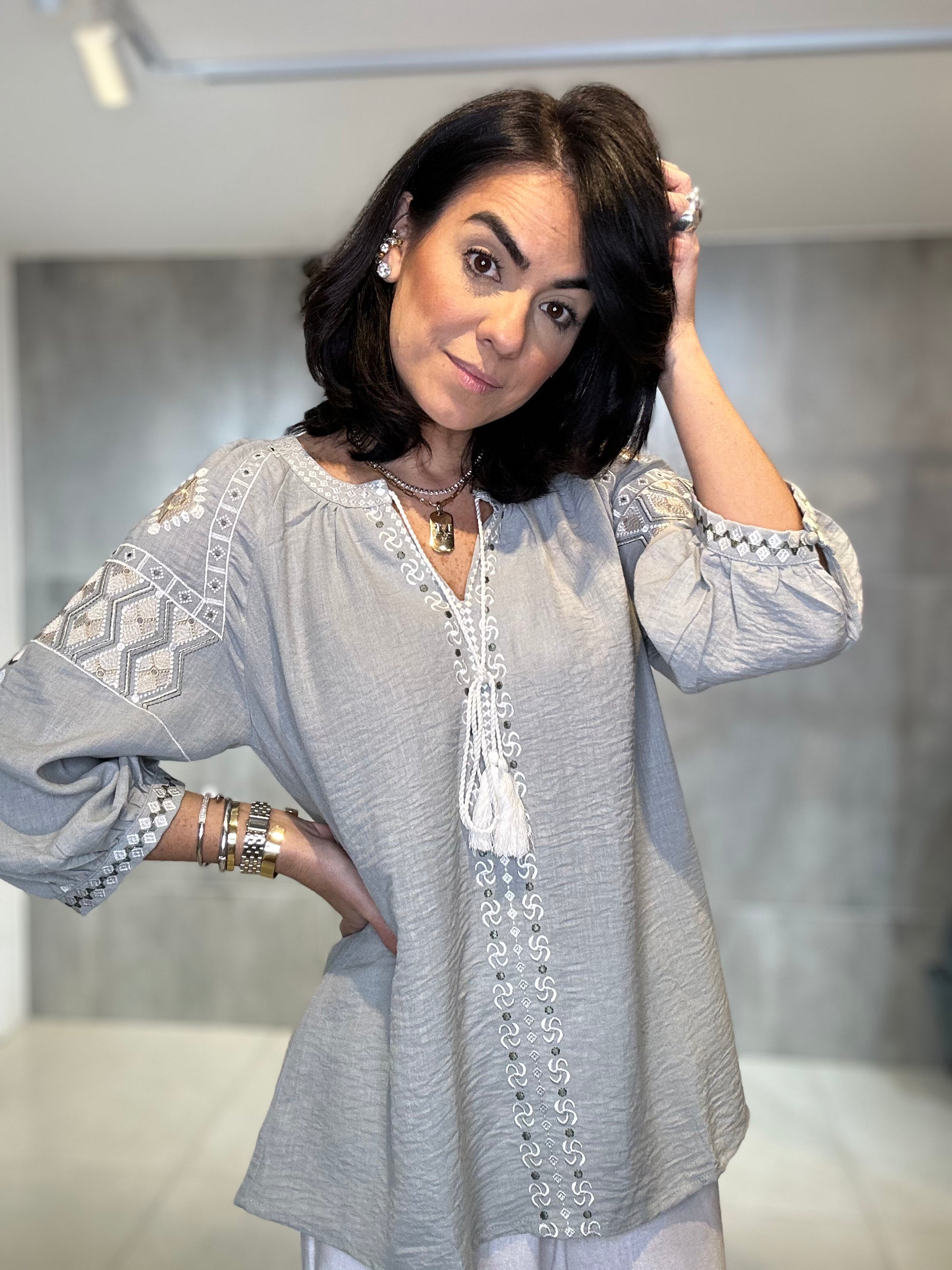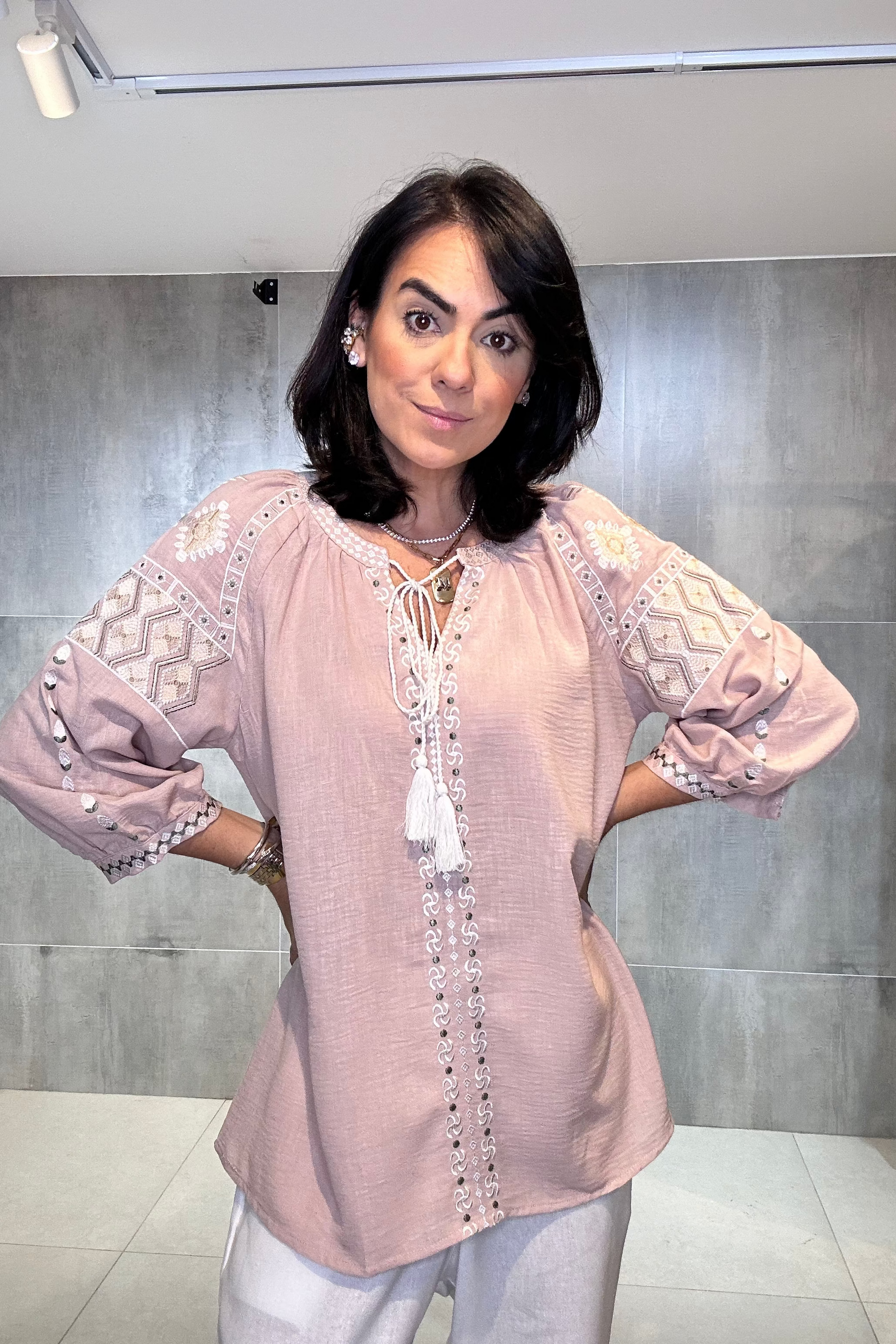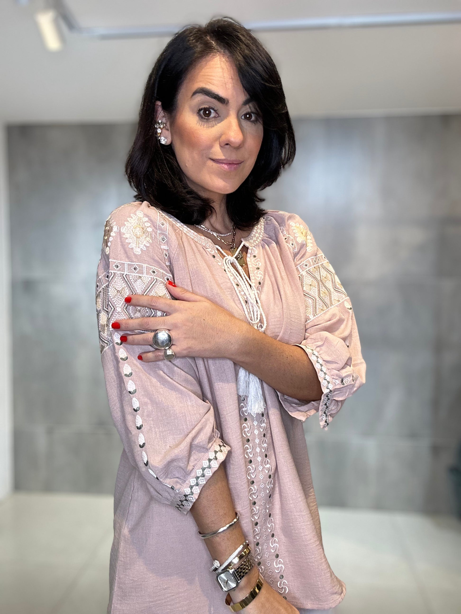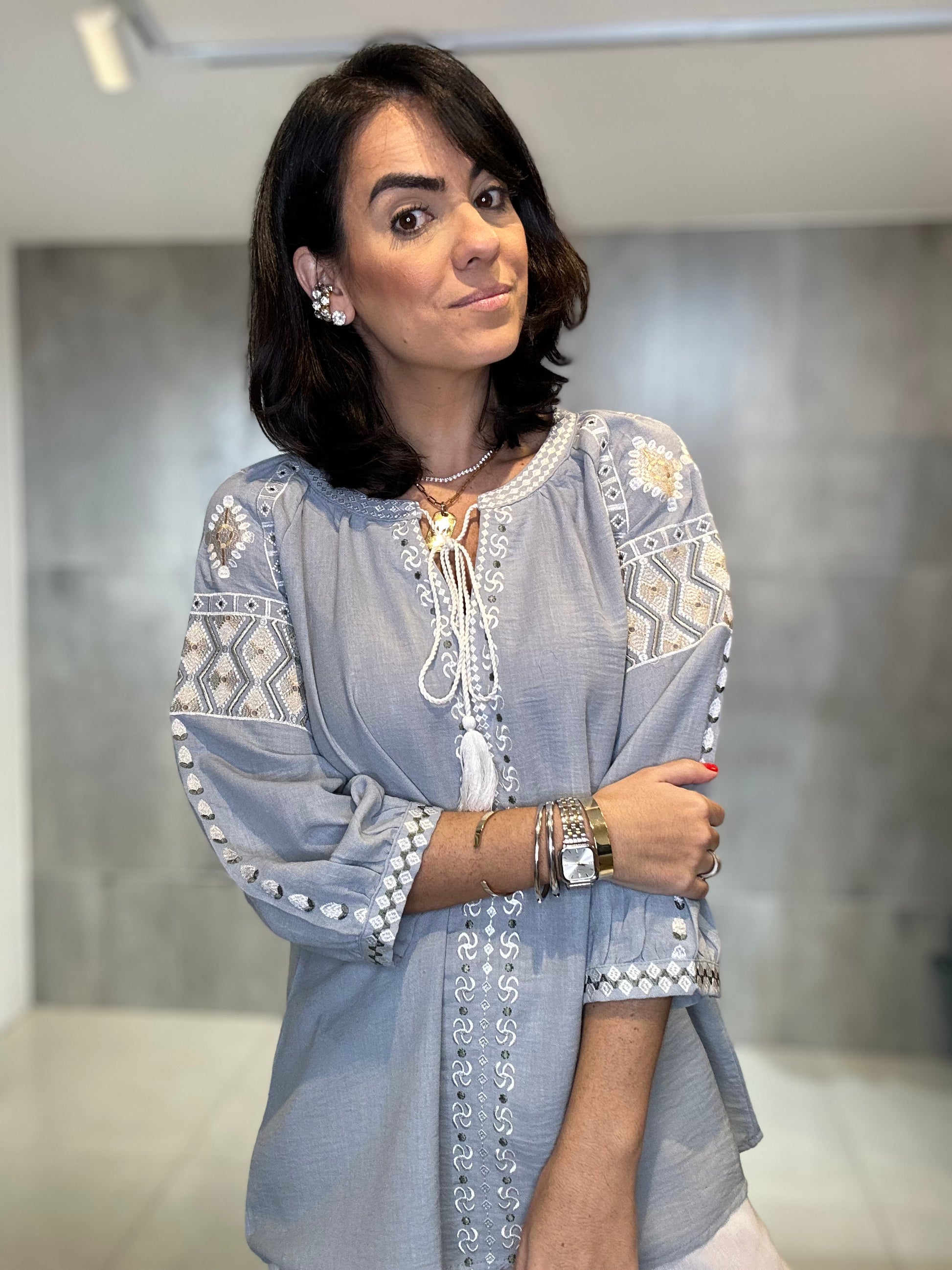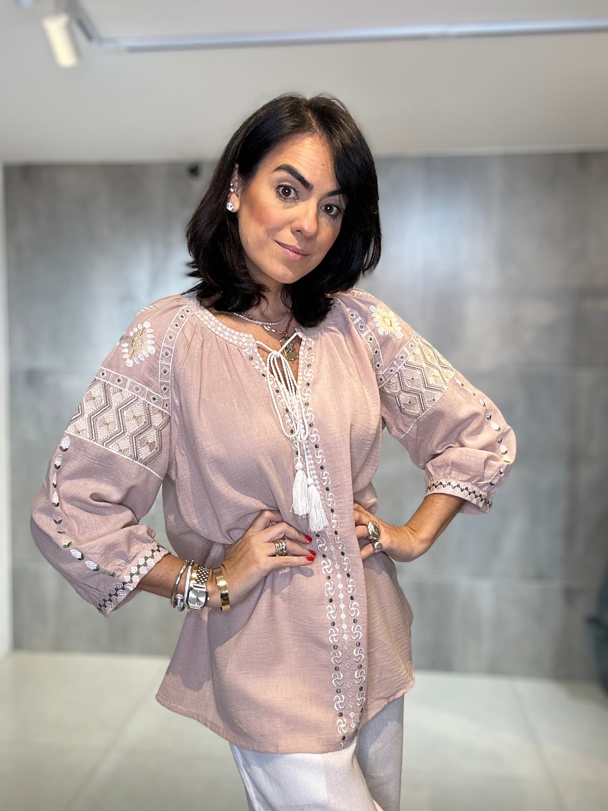 Bata ampla e solta, proporcionando conforto e um caimento leve. Rico bordado em linha de cor contrastante (branco/cru) nas mangas, ombros e peitilho. Os bordados nas mangas têm um padrão geométrico, enquanto os do peito são verticais. Estilo 3/4 com elástico/franzido discreto e acabamento bordado no punho, conferindo um leve volume. Decote em V com delicados botões frontais e um cadarço de amarração.