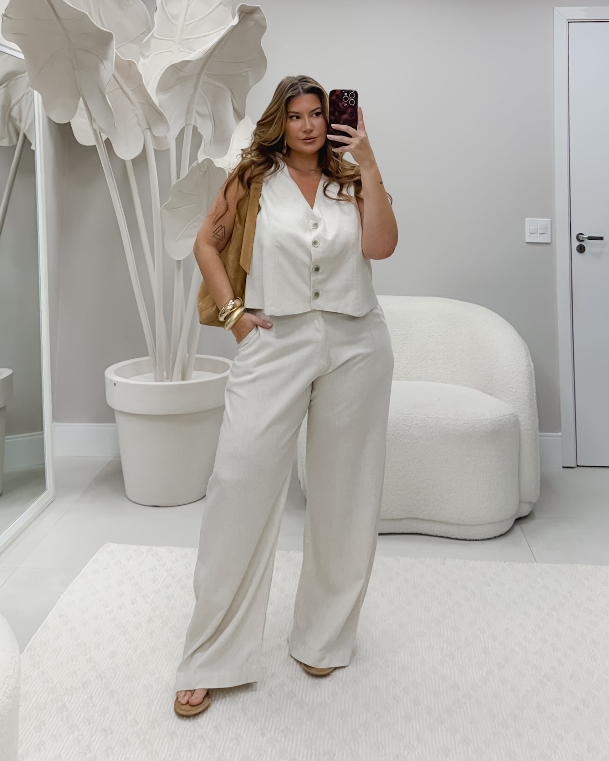 Calça de alfaiataria em tom off white, confeccionada em tecido leve e confortável. Modelagem reta com caimento solto, bolsos frontais e traseiros funcionais, além de fechamento frontal com zíper e botão. Peça versátil, que transita facilmente entre produções casuais e sofisticadas.
