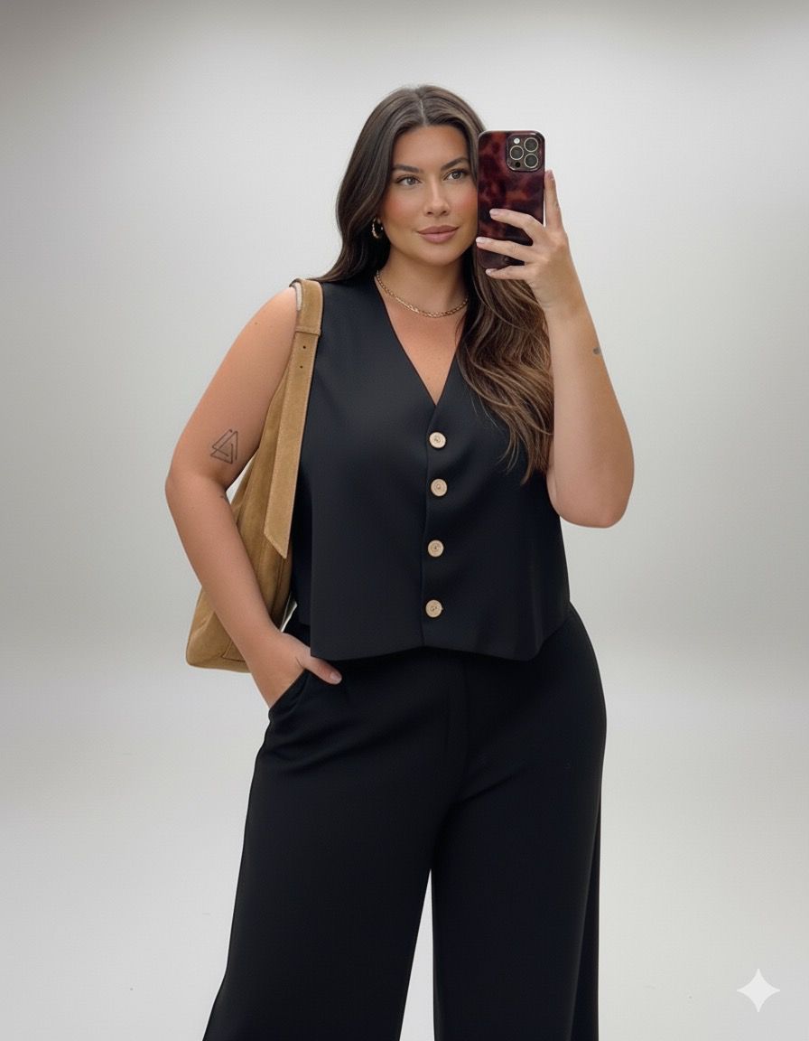 Esse colete em linho traz um toque de sofisticação e leveza para o dia a dia. Com modelagem reta, decote em V e fechamento frontal com botões contrastantes, é uma peça versátil que combina perfeitamente com calças, saias ou shorts. Ideal para compor looks frescos e estilosos em dias mais quentes.