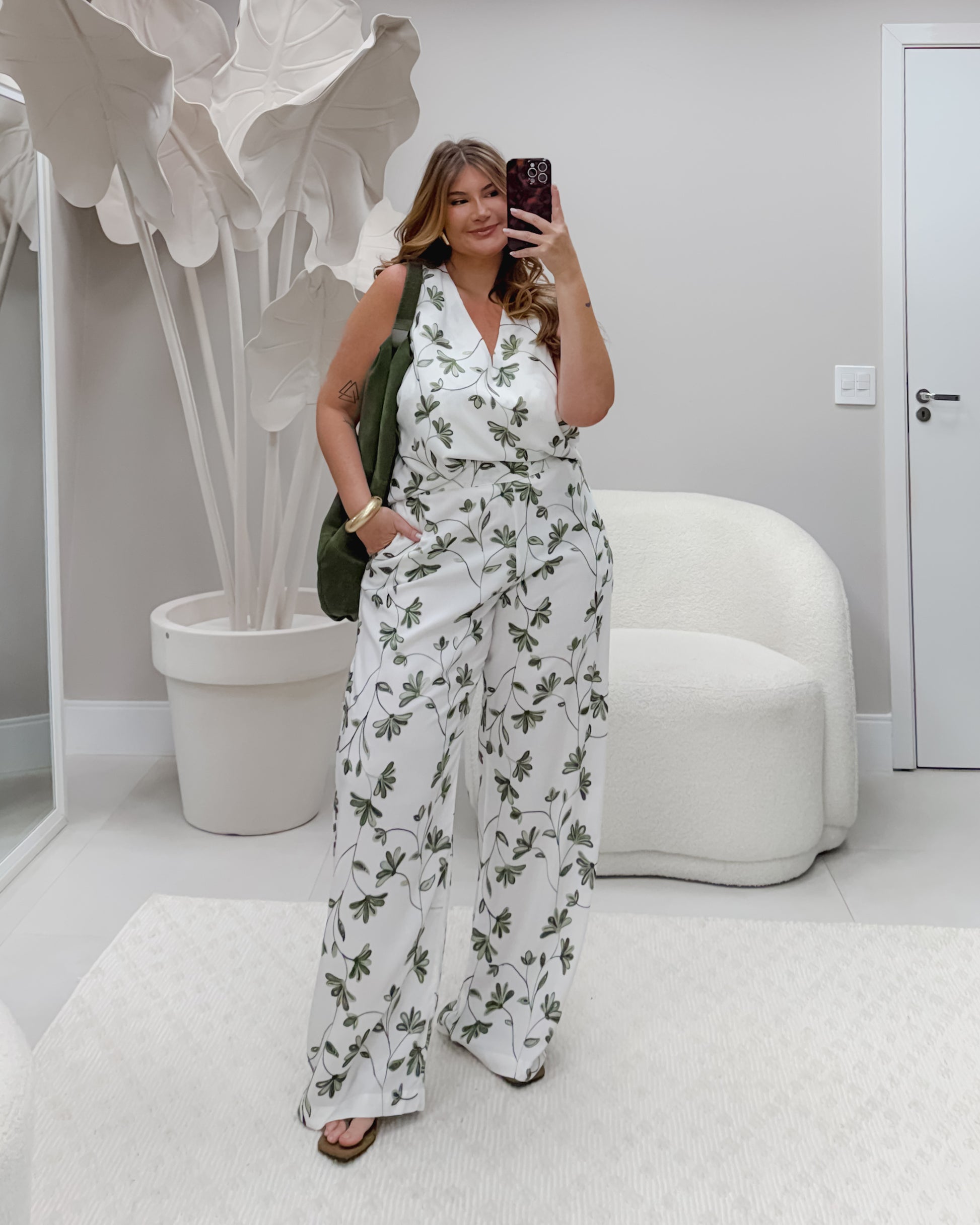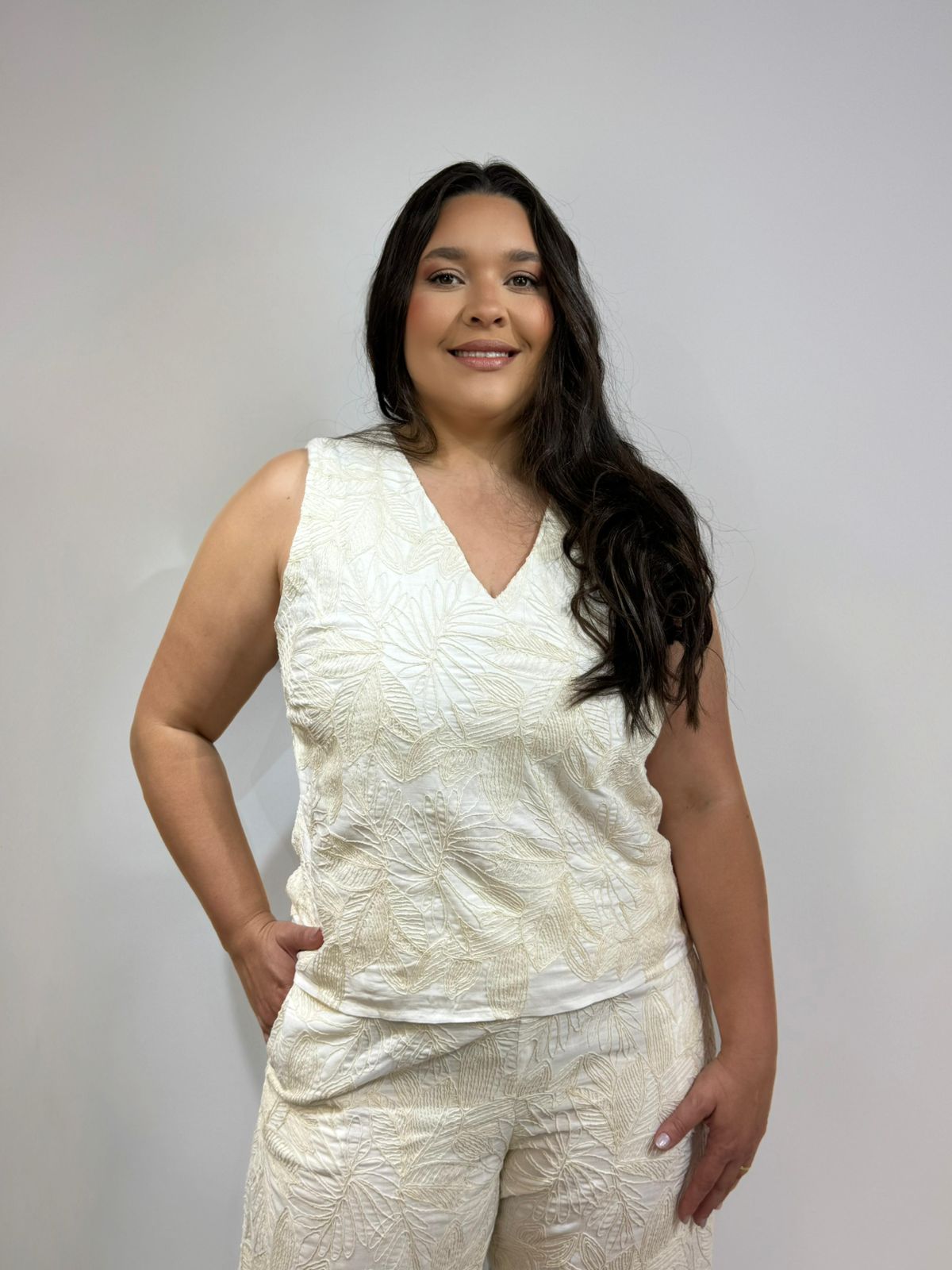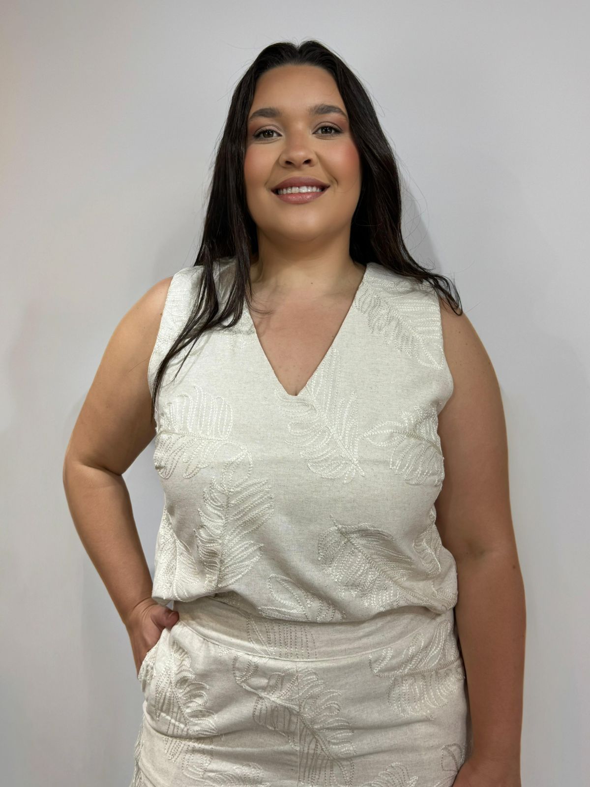 Blusa sem mangas em tecido leve, com decote em V e estampa botânica, bordada em relevo. Modelagem soltinha que garante conforto e frescor, unindo elegância e delicadeza nos detalhes.