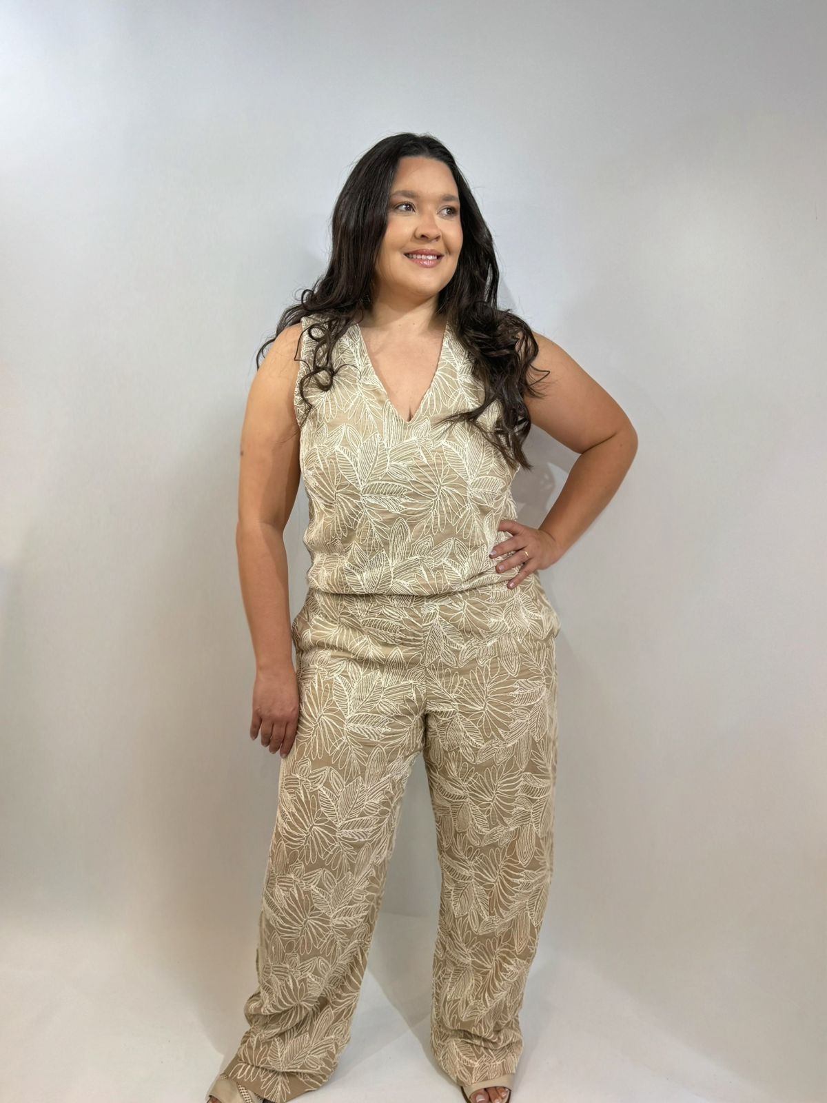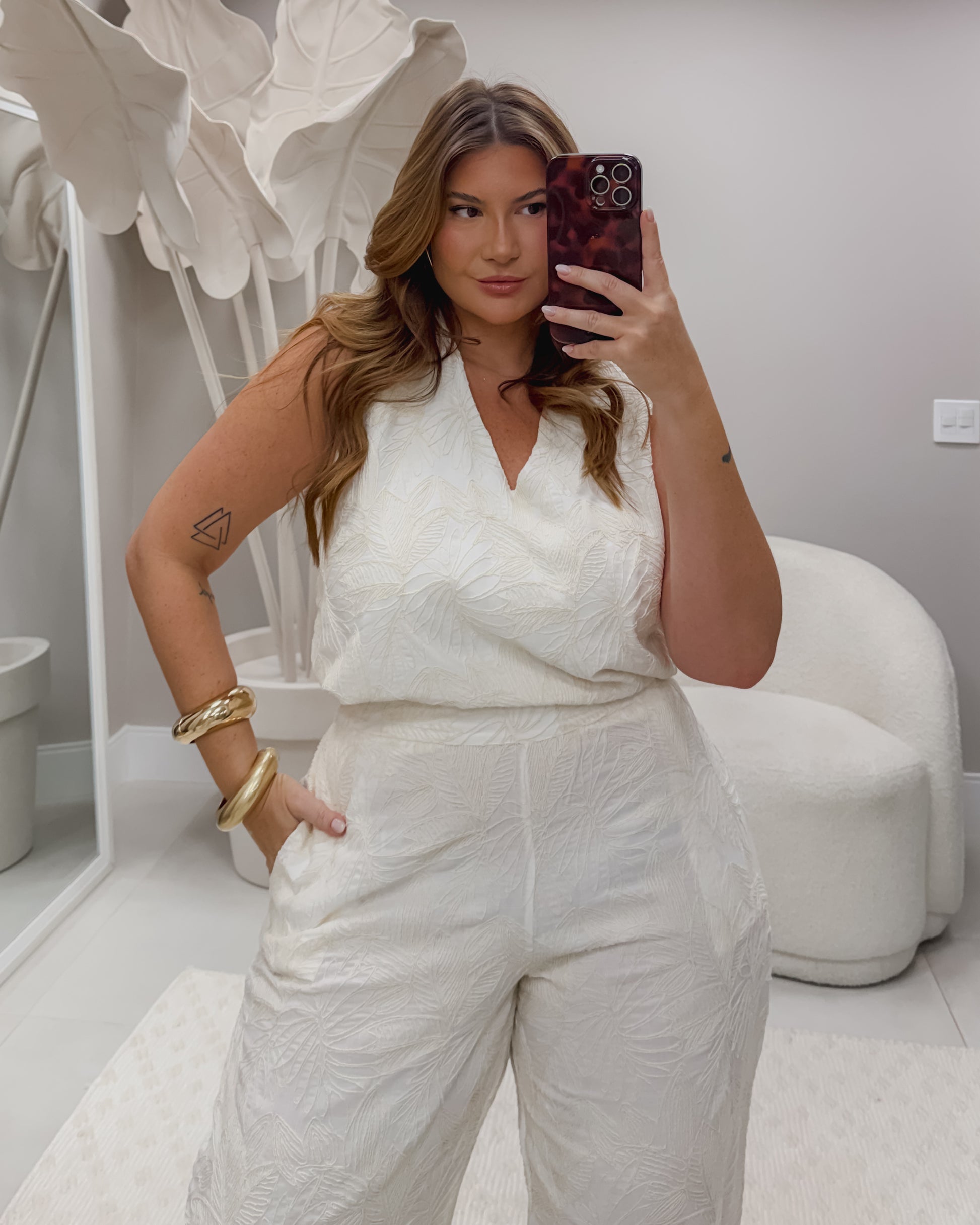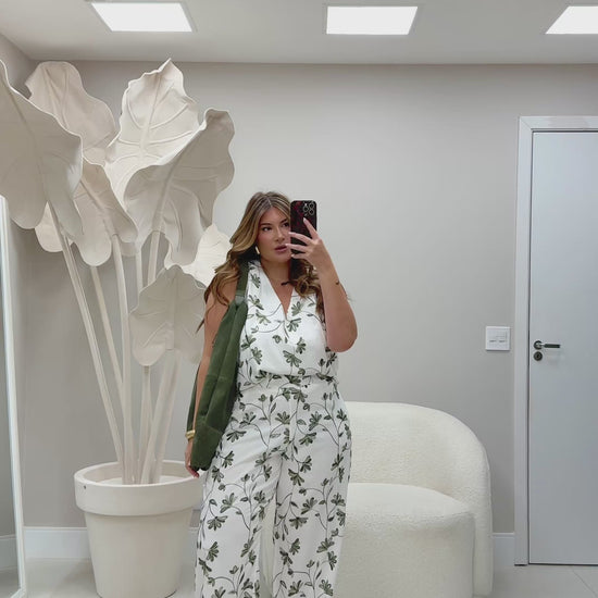 Blusa sem mangas em tecido leve, com decote em V e estampa botânica, bordada em relevo. Modelagem soltinha que garante conforto e frescor, unindo elegância e delicadeza nos detalhes.
