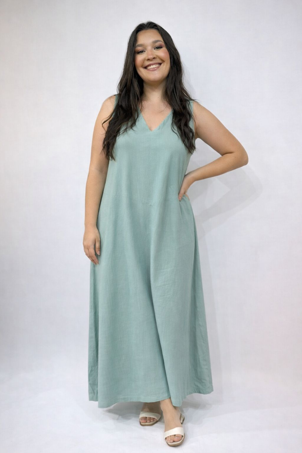 Vestido com alças cavadas, com decote em V na frente e nas costas, modelagem solta na parte inferior com aplicação de bolsos frontais funcionais.